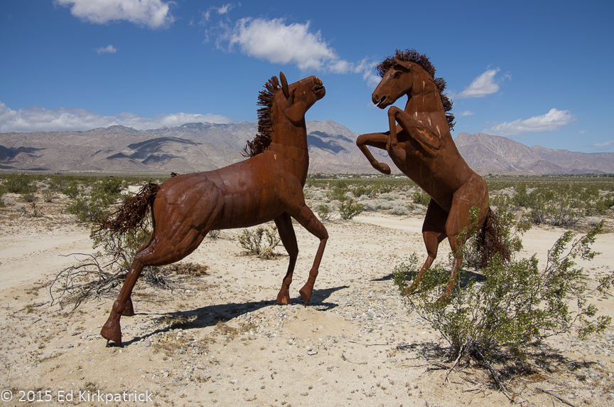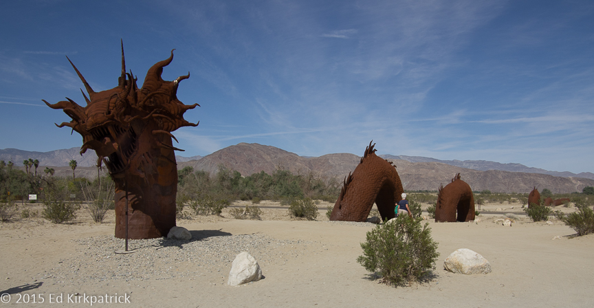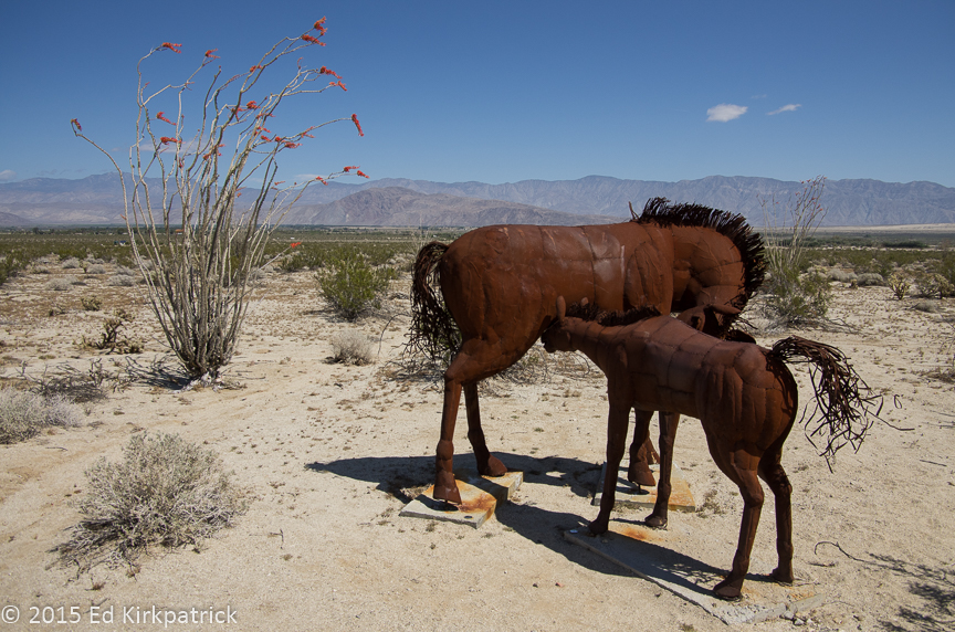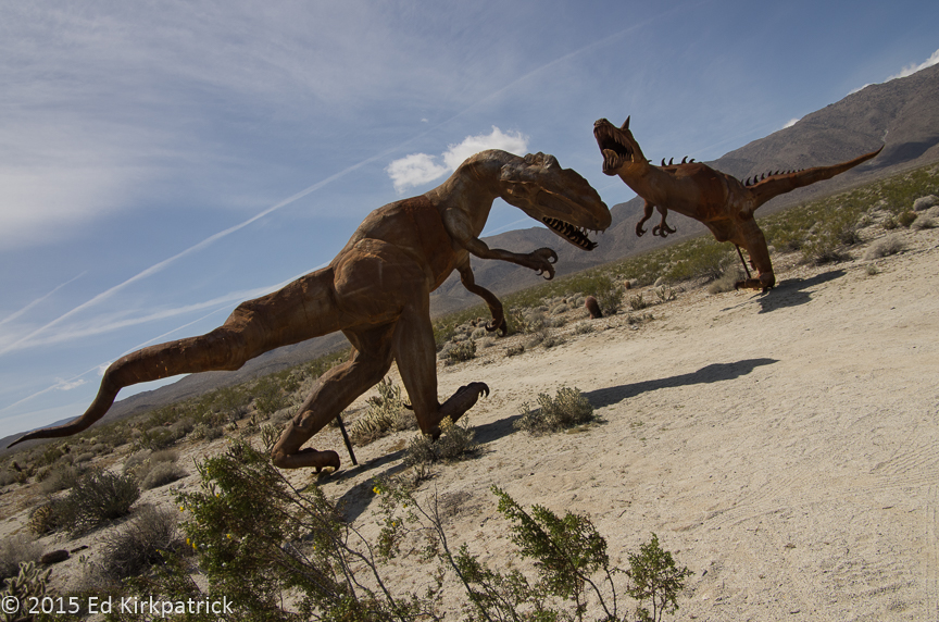 Scattered about the desert around Borrego Springs on the Galleta Meadows LLC property of philanthropist Dennis Avery (deceased) are 130 metal sculptures by Ricardo Breceda. After a bad accident Breceda could no longer do construction work and started selling exotic boots. Trading a pair of boots for a welding machine he started “playing” with it. At the request of his daughter to make her a life size dinosaur he discovered his hidden talent. Dennis Avery found him and together they have introduced some of the original “livestock” back into what is of course now desert. Lots of fun to see!20150406-_EKP1404
