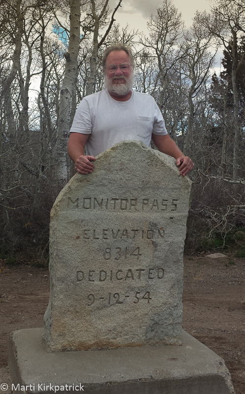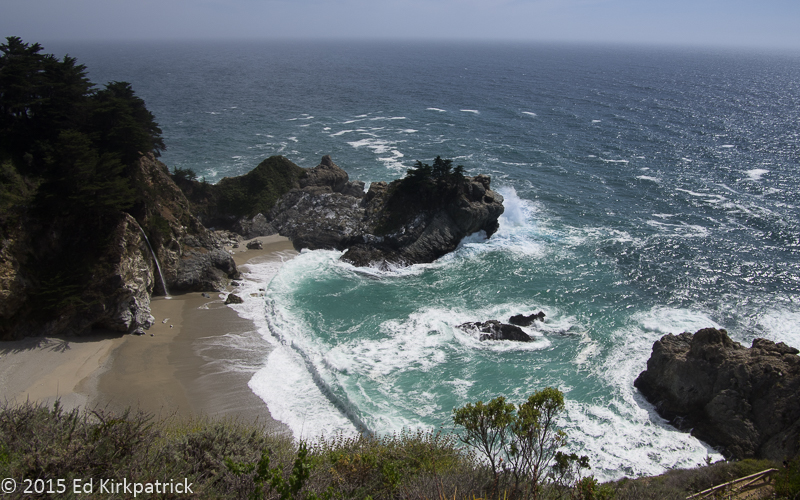 Back out on 101 the weather improved and we stopped several times to look at the Pacific seascape. Stopping on one narrow shoulder I thought I heard seals, so hopped out to look. Not too far out in the ocean was an impossibly steep big rock absolutely covered with seals all the way to the top! We have no idea how they got up there and unfortunately none came or left while we stood watching. A bicycling couple from Germany stopped and we shared our binoculars with them. They agreed, it just didn’t seem possible but clearly it was!